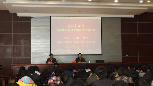 10月22日下午,在我校专家楼会议厅由重庆市涪陵区人民法院院长、高级法官王小林博士为学院师生作了题为《正心与正行》的报告会。