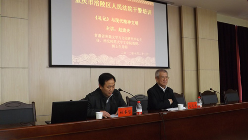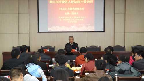 10月22日上午,学院在教学十号楼D区四楼多功能报告厅举行了重庆市涪陵区人民法院干警培训班开班仪式。开班仪式后,由甘肃省先秦文学与文化研究中心主任、我校文学院教授及博士生导师赵逵夫为干警同志们作了题为《<礼记>与现代精神文明》的讲座。