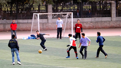 为了促进同学之间的交流,培养与激发同学们的团队意识,学院团委、学生会决定举办“迎新杯”五人制足球赛。2012年11月7日中午,“迎新杯” 五人制足球赛在西操场正式开赛,第一场对阵双方分别为11级法学班和10级法学班。
