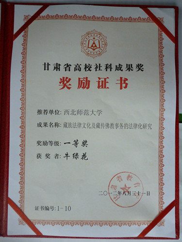 2、系列研究成果《藏族法律文化及藏传佛教事务的法律化研究》,获得甘肃省高校社科成果优秀奖一等奖。(2012年8月)