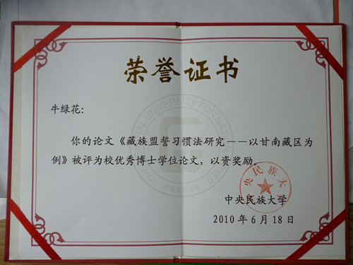 4、《藏族盟誓习惯法研究——以甘南藏区为例》,曾获得中央民族大学2010届优秀博士论文奖。