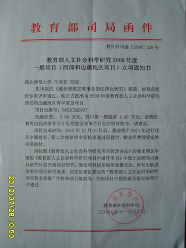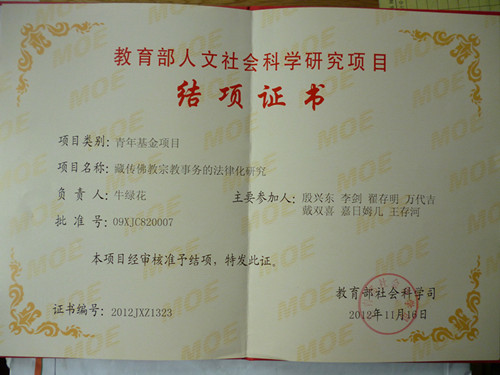 2、主持教育部人文社会科学研究项目,“藏传佛教宗教事务的法律化研究”,项目编号 09XJC820007,2009年。