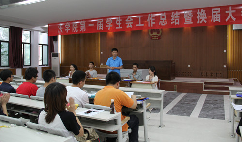 2013年7月5日下午,学院于模拟法庭举行了学院第一届学生会工作总结暨换届大会。学院党总支副书记李仁、团委老师张国文、辅导员李雯娟、学生会全体成员及学院各班级班干部参加了此次会议。