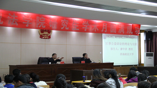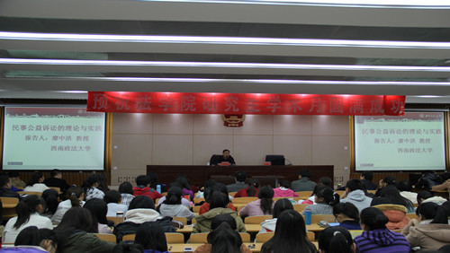 2013年10月25日下午三点,西南政法大学廖中洪教授在我院10教D区一楼模拟法庭,为我院研究生做了一场题为“民事公益诉讼的理论与实践”的学术报告。学术报告会由杜睿哲院长主持,吴国喆副院长等几位老师到场和学院的研究生、本科生一起交流学习,现场座无虚席。