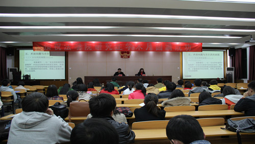 2013年11月8日晚,在教学10号楼E区一楼模拟法庭,学院青年教师熊征博士作了题为《法律人类学纠纷解决研究方法综述》的学术报告。此次报告会是学院研究生学术月的系列活动之一,由牛绿花教授主持。学院教师、研究生、本科生一百余人参会。