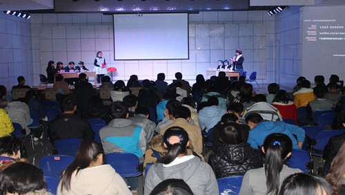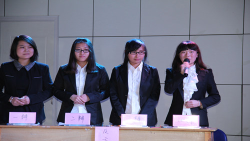 27日晚的辩论赛为“四院联赛”的总决赛,当晚进行了两场比赛。第一场为社会发展与公共管理学院代表队和数学与统计学院代表队的表演赛,辩题为“爱在暧昧不明时更美还是情真意切时更美”;第二场为学院代表队与马克思主义学院代表队的冠军争夺战,双方就“评价行为善恶的标准是动机还是效果”展开辩论。正反双方选手口齿伶俐、思维敏捷、辩论激烈、表现精彩,掀起了一个又一个的辩论高潮,赢得现场观众一次又一次的热烈掌声。通过立论、驳论、攻辩、自由辩、观众提问、陈词总结等六个环节的激烈交锋,由郭思彤、程影慧、马蕊、亢雪茹“四朵金花”组成的学院代表队,以流畅的语言表达、严密的逻辑思维、扎实的专业功底、丰富的知识储备、良好的精神风貌,令人信服地夺得“四院联合辩论赛”冠军。
