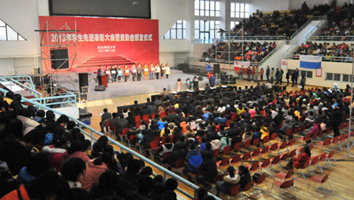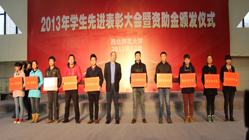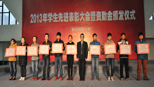 2013年12月27日,学校在体育馆隆重举行2013年学生先进表彰大会暨资助金颁发仪式。校党委书记刘基、校长刘仲奎、党委副书记于树青、副校长万明刚、刘玉泉、丁虎生出席会议。我院党总支书记张喜爱、副书记李仁、团委书记赵小培及获奖学生代表48人参加了此次大会。大会由于树青副书记主持。