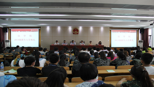 9月4日下午,学院在模拟法庭举行2014级新生开学典礼。学院领导、系主任、新生班主任、教务秘书、团学老师以及2014级本科生、研究生参加了活动。典礼在优美的校歌声中拉开序幕,学院党委书记张喜爱研究员致欢迎词,对来自21个省份、13个民族的154名优秀学子,以优异成绩考入西北师大学院表示衷心祝贺和热烈欢迎。希望同学们志存高远,奋发有为,科学规划大学期间的学习、生活, 积极融入到学院这个大集体中来,实现人生新的转型跨越。院长杜睿哲教授在典礼上讲话,杜院长以十八大后“依法治国”方略为背景,以“卓越法律人才培养”为主题,寄语同学们刻苦学习,勤于思考,坚定追求自己的理想,坚持法律人的底线,恪守职业道德,积极进取,学以致用,努力成为国家社会的栋梁之才。