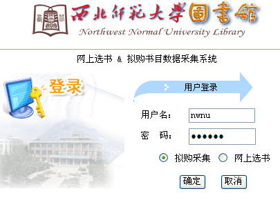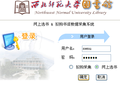 打开网页后看到如下界面,输入录用户名:nwnu ,密码:123456 点开:网上选书,点击确定。