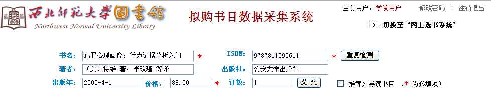 进入如下界面,输入要用的书籍,点击提交,如果提交失败,说明本馆已经订购了这本书。