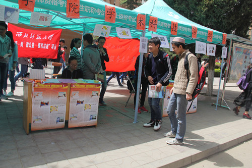 为进一步引导大学生培养科学精神,积极学习科学知识和方法,提高大学生自我法律文化水平和推动校园普法工作的进程。4月16日在教学10楼前,我院集中进行了2015年学术科技文化节主题日宣传活动。内容包括开展首届“丝路杯”大学生文学艺术作品竞赛、甘肃省第十届“挑战杯”大学生课外学术科技作品展、“博学明辩、知礼识政”师大杯辩论赛等活动。