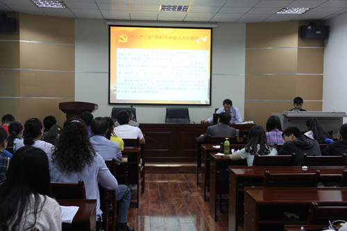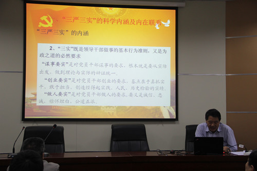 根据学校党委开展“三严三实”专题教育部署要求,5月29日下午,学院党委书记张喜爱为学院师生党员讲《以“三严三实”专题教育深入推进作风建设》为题的专题党课,学院领导班子成员、所属各支部书记、师生党员共60余人听取了党课。专题党课从“三严三实”的科学内涵及内在联系、充分认识“三严三实”要求的现实意义和践行“三严三实”的基本要求等三个方面进行了讲解,同时对学院开展“三严三实”专题教育进行了安排和布置。学院将按照制定的“三严三实”专题教育实施意见,有计划、按步骤,精心组织,扎实有效开展专题教育,力求在作风建设方面取得新成效,保障和促进学院改革发展和内涵式发展。