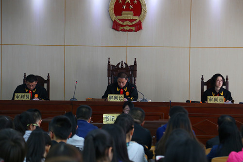 4月14日下午,开放周第三场活动——资源共享与能力提升:案件庭审与研讨在模拟法庭举行。本场活动为法律审判进校园活动,甘肃省高级人民法院行政庭法官、上诉人、被上诉人、第三人及学院师生200余人参加了公开庭审,庭审案件为工伤保险行政案件上诉案。