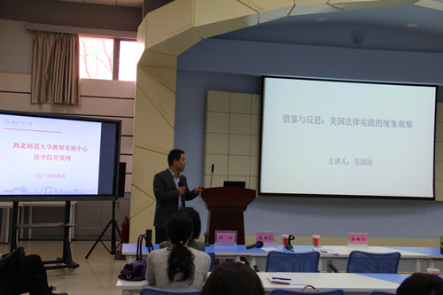 学院吴国喆教授作了题为《借鉴与反思:美国法律实践的现象观察》的报告。吴国喆教授从自己在美国生活期间亲身感受到的几个具体事情入手,通过解读其中蕴含的法律精神,进而分析启发和借鉴意义,揭示了法律无非生活,生活中的点点滴滴总是同一定的法律精神、法律规则相关联,论证了从现象解读法律是一个外来观察者研习法律的基本方法。报告前,主持人学院苏婉儿博士首先阐释法律的实施情况是一个民族的典型特征的观点,学习者自己去体会其基本运行情况非常重要,在无法亲身感知的情境下,第二手的经验也非常有价值,由此大大增强了本场报告的说服力和感染力。