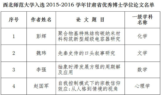 近日,甘肃省学位委员会、甘肃省教育厅公布2015-2016学年甘肃省优秀博士硕士学位论文名单,我校《聚合物基特殊结构碳纳米材料构筑新型超级电容器研究》等4篇论文被评为2015-2016学年甘肃省优秀博士学位论文,我院2013级法学理论专业研究生王永祥的《主权在法:最优政体的此世性——英格兰法治样式由来考》等14篇论文被评为2015-2016学年甘肃省优秀硕士学位论文。