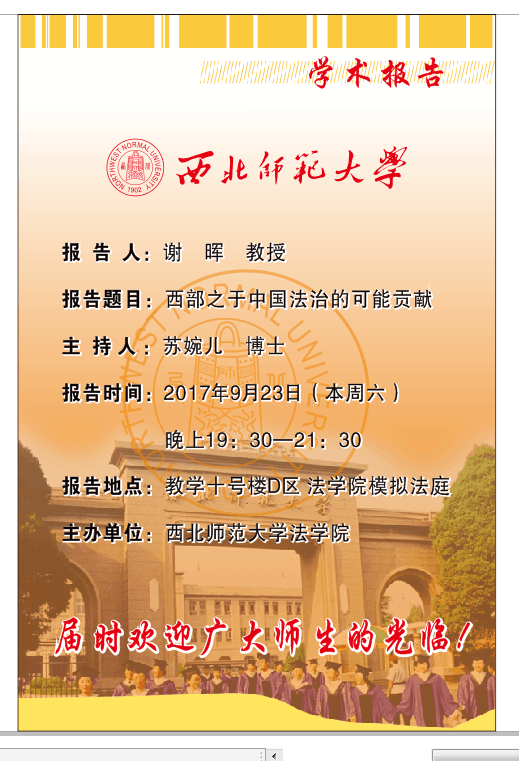 各位师生:应我校学院邀请,广州大学谢晖教授将于9月23日来我校做学术报告,欢迎广大师生参加!报告具体事宜安排如下: