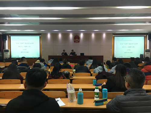 2017年11月24日,为积极响应学院研究生学术月的号召,我院副院长、硕士生导师齐建辉博士在模拟法庭作了一场题为“不识‘东西’的法学与法律”的学术报告。报告会由法学研究所所长、法律硕士教育中心主任车亮亮博士主持,学院2016级、2017级全体研究生参加了本次报告会。