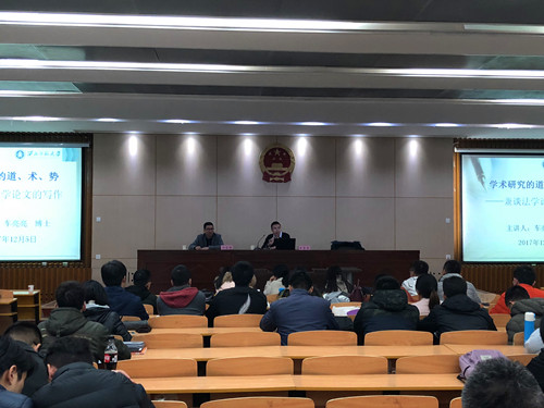 2017年12月5日,为积极响应学院研究生学术月的号召,我院法学研究所所长车亮亮博士在模拟法庭作了一场题为“学术研究的道、术、势——兼谈法学论文的写作”的学术报告。本次学术报告由法律系主任何俊毅博士主持,我院师生150余人到场参加了本次报告会。