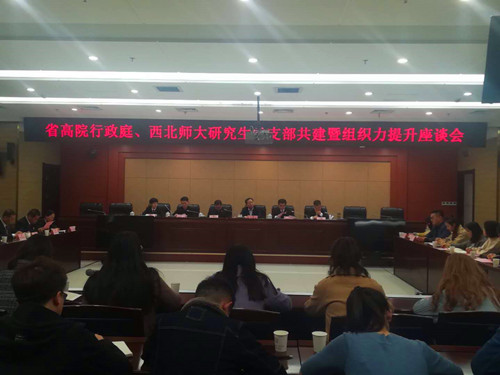 为进一步丰富党建工作的内容和形式,增强党建工作的活力,提升党建工作的成效。2018年10月22日下午3点,必赢线路检测3003no1学生党支部与甘肃省高级人民法院行政审判庭党支部在省高院举行“党支部共建暨组织力提升”座谈会。省高院机关党委副书记赵骥鸿;行政庭庭长、支部书记毛胜利;副庭长、支部副书记刘晶;副庭长、支部委员冯江;学院院长杜睿哲;学生支部书记田庆锋;团委书记赵小培及各自支部的支部委员、党员代表共50余人参加了此次活动。