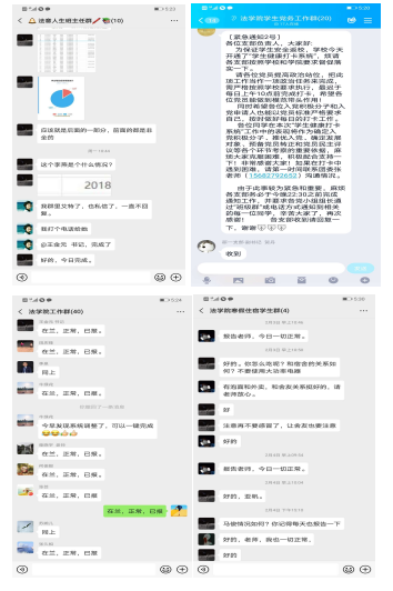 疫情就是命令,防控就是责任。为保证学院能够及时有效掌握全体学生动态,保证学生数据真实有效,没有疏漏,学院及时采取“一师一群”专人负责开展学生每日信息统计工作。一是全力排查在校学生和返家学生去向,建立“留校学生每日信息动态群”,要求群内学生及时化、直接化每日上报个人健康、学习及外出信息,有效做到了24小时防控;二是全力开展湖北籍、武汉籍学生疫情防控排查工作,建立“疫情区学生信息动态监测群”,对疫情比较严重地区的学生进行实时监测,实行日报告制度,每天早8:00和晚9:00向群内老师报告自己和家人健康状况;三是全力排查寒假期间外出旅游、探亲学生去向,建立“假期学生外出动态管控群”,对假期外出旅游、探亲等出入密集人群场所的学生进行摸排,每日向学院报告其当前所在地、接触人员及健康状况;四是实行导师、班主任、辅导员负责制,建立“疫情防控工作交流群”,各导师、班主任、辅导员每日在群内向学院报告自己学生健康状况和动态。通过以上措施,确保学生信息交流通畅、工作不留死角。