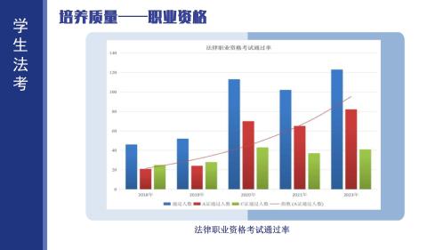 作为从事公检法、律师等职业的必备条件,也是法学专业学生就业的重要依据,全国统一法律职业资格考试(2017年前称“司法考试”)通过率的高低是体现学院人才培养质量和水平的一项重要指标,近年来,学生法考通过率远高于全国平均通过率。