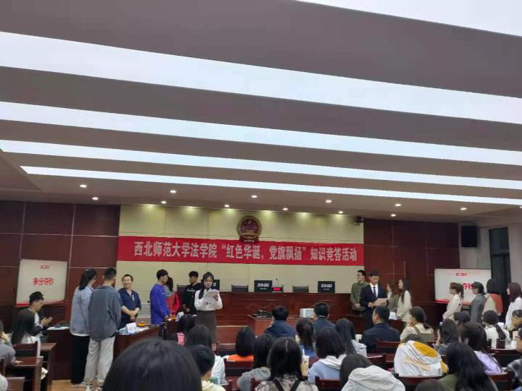 为庆祝中国共产党100周岁华诞,进一步引导广大学生党员深入学习党的历史,增强党性观念,提升党性修养,4月22日晚19:30分,学院“红色华诞,党旗飘扬”知识竞赛在模拟法庭开赛。学院党委书记李发军同志、党委副书记王金元同志、团委书记张永祯同志、专职辅导员、本科生第一党支部书记宋香云同志及全体学生党员约130余人观看了比赛。
