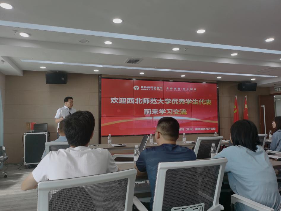 李玉明律师首先表达了对学院师生一行的热烈欢迎,并对双方展开进一步合作表示期待。接着就北京市盈科(兰州)律师事务所的律所管理、党建引领、专业建设、人才建设、文化品牌、公益活动等方面的工作开展情况进行了详细介绍。并针对广大学生,就理论与实训的过渡对接、复合人才的打造、中国法治人才的培养、中国法律及法律人才国际化发展等方面阐述了自己的认识和观点,由衷地表达了对莘莘学子的关心和关切。