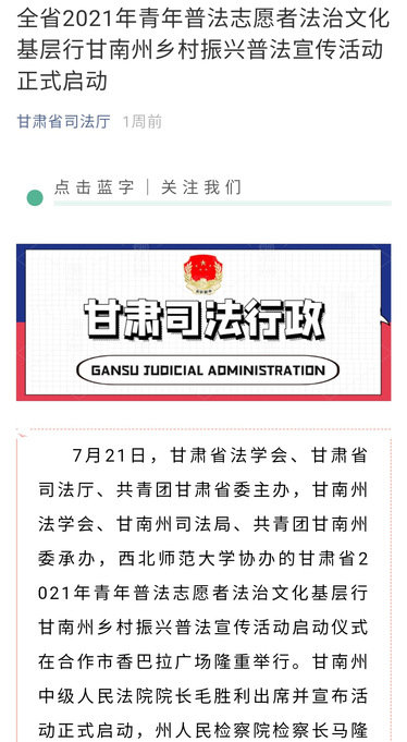 7月20日—27日,必赢线路检测3003no1李玉璧副教授、宋香云老师带领14名青年普法志愿者赴甘南藏族自治州开展了为期8天的甘南涉藏地区乡村振兴普法宣传与红色法治文化调研活动。此次活动旨在认真贯彻落实习近平新时代中国特色社会主义思想,通过专家教授对习近平法治思想的讲解,引导和帮助广大青年学生在了解省情、民情的基础上上好与实践结合的“大思政课”,在社会大课堂中受教育、长才干、作贡献,在观察实践中学党史、强信念、跟党走。8天中,学院青年普法志愿者先后深入甘南州合作市、夏河县、卓尼县、临潭县及迭部县开展实践活动,严格按照团省委和校团委相关要求圆满完成了各项任务。