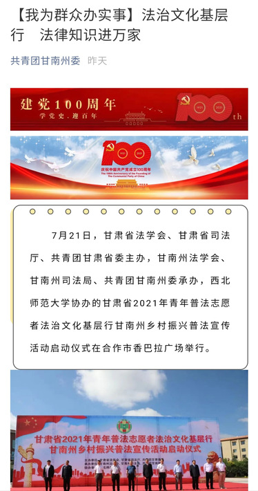 党的十九大报告强调,要加大全民普法力度,建设社会主义法治文化,树立宪法法律至上、法律面前人人平等的法治理念。学院青年普法实践团认真落实依法治国基本方略,先后走进合作市香巴拉广场、夏河县广场、卓尼县广场、迭部县广场、佐盖曼玛乡、扎油乡等七个地域开展习近平法治思想宣讲、民法典及乡村振兴战略宣传,同时结合专业为广大群众提供法律咨询与法律服务,社会反向热烈,成效显著,被当地“甘南头条”“甘南电视台”等新闻媒体广泛宣传。2021年是中国共产党建党100周年的重要年份,实践团结合党史学习教育,全程开展了“民众红色法治观念”的调研工作,获取了丰富的第一手资料;在下扎油村与唐赛尔村入户调研时,了解到当地村民在遇到法律问题时,并不会通过诉讼救济自己权利的种种原因;与甘南州中级人民法院、临潭县人民法院以及迭部县司法局开展法治建设交流时,近距离感受司法信息化、智能化建设所带来的便利,聆听司法一线工作者的丰富实务经验和实务中存在的问题。队员们通过深入基层,走在一线,提升了专业认知与认同,并为甘南藏族自治州“八五”普法精准开展奠定了较好基础,提供数据支撑,也为更好的推进全民普法提供参考方向。