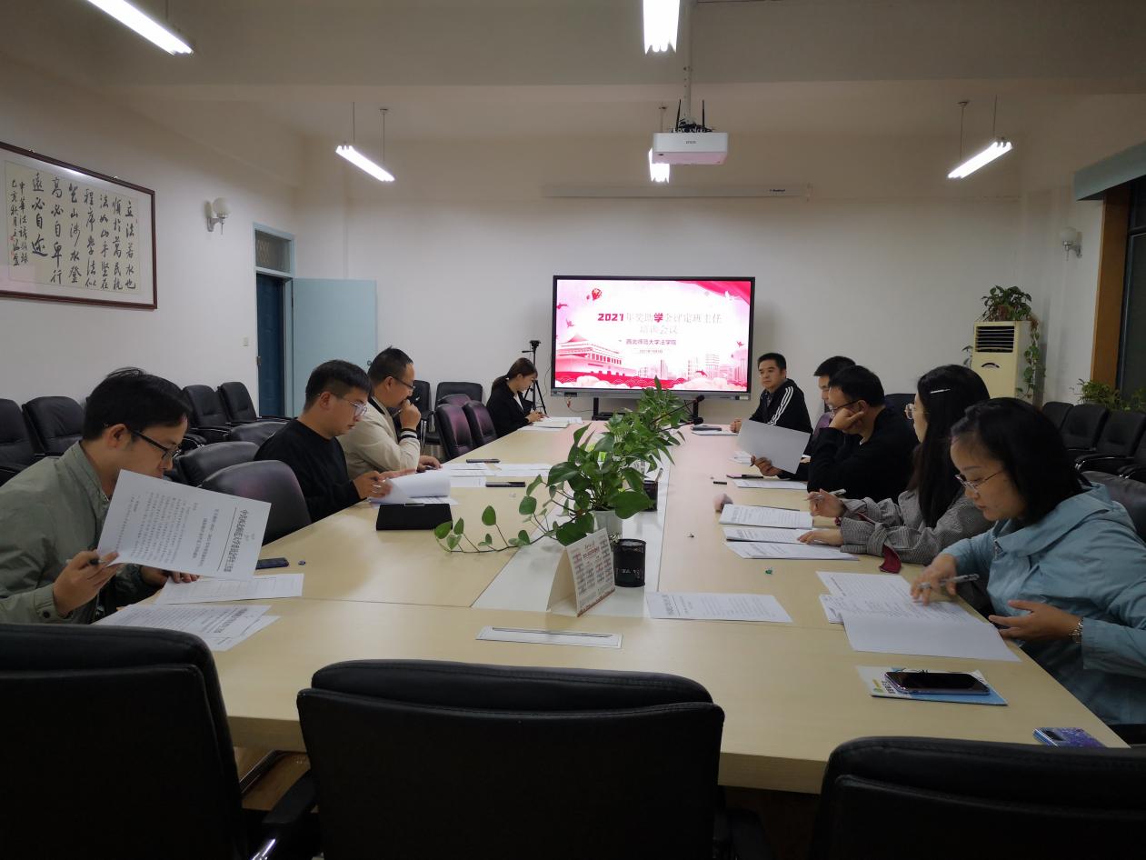 10月8日下午18:30分,学院2021—2022学年度班主任工作会议暨本科生奖助学金评定工作培训会在307会议室召开。学院学生工作负责人、全体本科生班主任及辅导员参加会议。会议由党委副书记王金元主持。