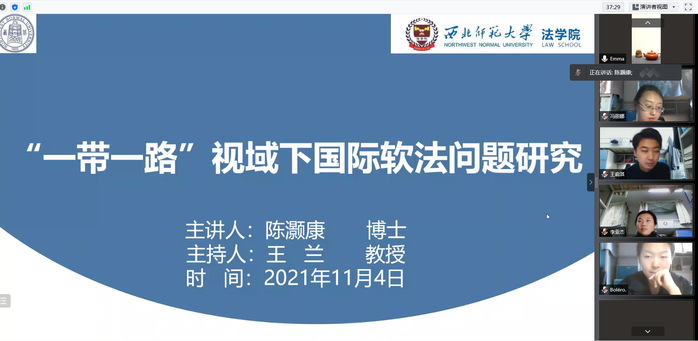 根据学院“研究生学术月”青年博士学术报告活动安排,2021年11月4日15时,学院青年博士陈灏康老师通过“腾讯会议”为我院师生作了一场题为《“一带一路”视域下国际软法问题研究》的线上学术报告。该报告由王兰教授主持,我院全体研究生在线聆听了此次报告。