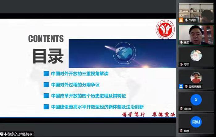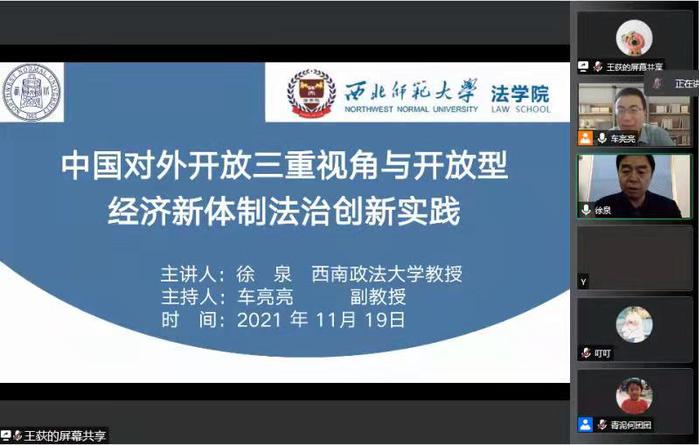 为深入理解当前我国开放型经济新体制的法治创新动态,根据学院“研究生学术月”活动安排,2021年11月19日,学院特邀西南政法大学徐泉教授开展了“中国对外开放三重视角与开放型经济新体制法治创新实践”的专题报告。该报告由车亮亮副教授主持,我院全体研究生和本科生在线聆听了此次报告。