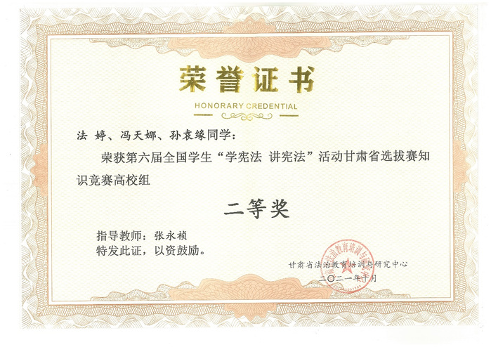 我院派出的法婷、冯天娜和孙袁缘3名同学参加了知识竞赛,郭静茹同学参加了演讲比赛。经过激烈的角逐,西北师范大学知识竞赛代表队最终以183分的成绩获得二等奖;郭静茹同学以《感知宪法力量,铸就奋进时代》为题,以个人亲身经历为内容生动阐释了宪法的实际运用情况,最终获得演讲比赛二等奖。