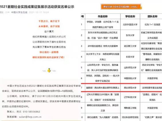 近日,教育部中国大学生在线公布了全国高校2021年暑期社会实践成果征集展示活动获奖名单,学院“乡村振兴普法宣传暨红色法治文化调研”实践团获理论宣讲十佳社会实践团队荣誉称号。