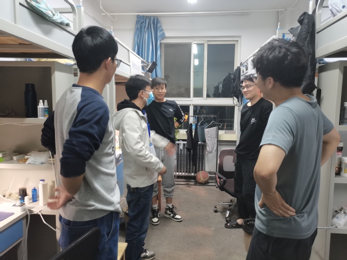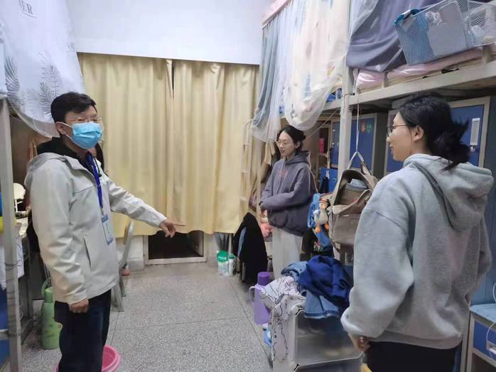 走访过程中,张永祯老师与研究生一、二年级同学深入交流,详细了解学生的学习情况,询问了同学们生活方面的问题并进行现场解答。同时也叮嘱同学们要严格遵守疫情防控期间校园管理要求,提高防范意识,做好科学防护,营造舒适的学习生活环境。张老师对学生寝室可能存在的安全隐患进行了排查,再次强调春季禁止使用违章电器,务必做好寝室消防安全。针对当下疫情,张老师提醒同学们定时进行消杀,保持寝室空气流通以及干净整洁,注意自身身体健康状况,有异常情况要第一时间报告。