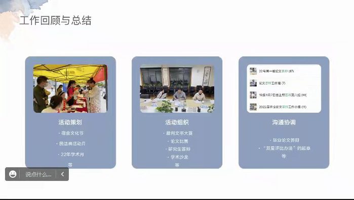 为充分发挥奖学金的激励作用,大力树立模范学生干部典型,培养更多积极践行社会主义核心价值观、综合素质优秀且热心为同学服务的优秀学生干部,学院于2022年9月30日下午16时在腾讯会议举办了优秀研究生干部奖答辩会。此次答辩会以公平公正公开为原则,由党委书记李发军、院长何俊毅、党委副书记王金元、田庆锋老师、马敬老师、曾庆辉老师及张海颖老师作为评委参加评选,并邀请全体2020级、2021级研究生线上观摩学习。陆昊、李雪梅、张家玮、王荻、法婷等8名同学参加答辩。