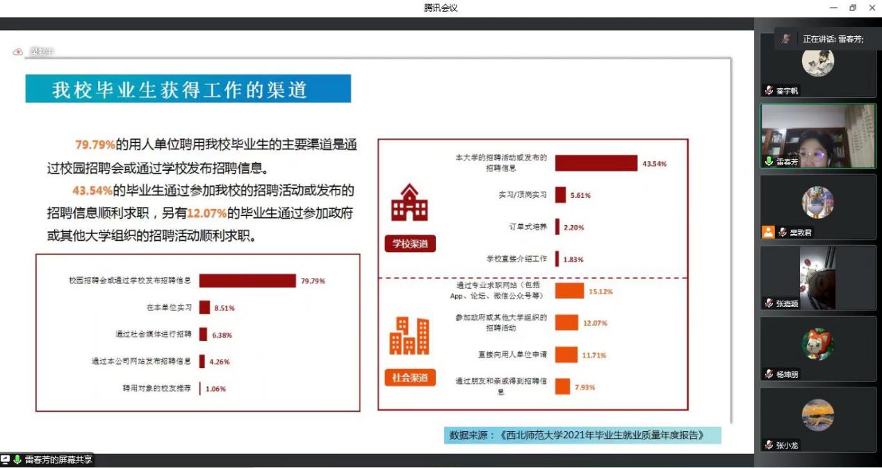 雷春芳老师对当前就业形势进行了详细的分析,并针对我校往年应届毕业生就业的实际情况提出“三个重视”,从求职途径、求职心态、就业流程三个方面层层递进地讲述了毕业生在求职就业过程中应当注重的问题,为同学们未来的求职路扫除障碍。
