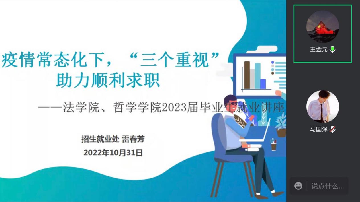 2022年10月31日晚7点30分,学院与哲学学院联合主办了以“疫情常态化下,‘三个重视’助力顺利求职”为主题的线上就业指导专题论坛,本次专题论坛由学院党委副书记王金元主持,由西北师范大学招生就业处就业指导教师、GCDF全球职业规划师、高级就业指导师雷春芳老师主讲,学院及哲学学院全体2023届毕业生参与论坛。雷春芳老师与同学们分享求职就业经验,线上解答同学们的疑惑。