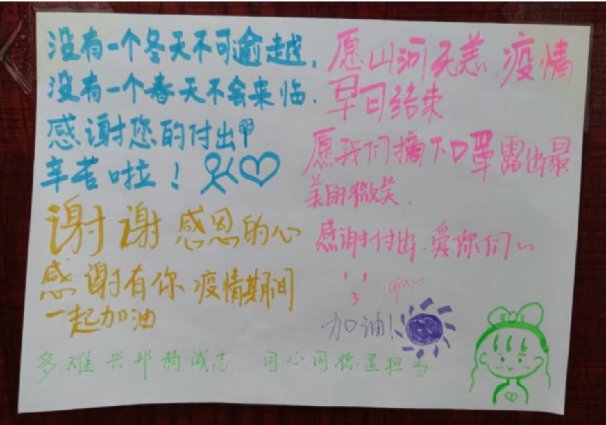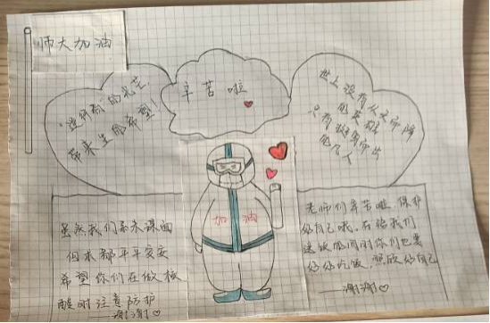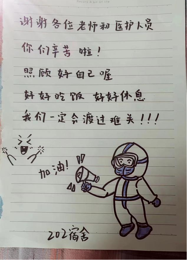11月3日以来,基于学校疫情防控形势的新变化,学校对疫情防控政策进行了一系列调整,要求各位在校学生足不出室、一日三餐和饮水等由各位驻校老师送物上门。连日来,许许多多被同学们亲切称呼为“大白”的、身穿防护服的老师们忙碌地奔波于四个校区20余栋宿舍楼之间,送餐、送水、消杀、做核酸,虽然他们每天“只闻其声,不见其人”,但却以自己的行动默默地诠释了何为“学高为师,身正为范”,温暖地守护了同学们的安全。有的老师在送水时扭伤了腰仍然咬牙继续前行,有的老师感冒发烧仍然“轻伤不下火线”,有的老师舍小家、为大家,将自己的孩子托付他人来照顾同学们……老师们的举动使人泪目,温暖驱散了初冬的寒意,温暖也早已化为每天取餐时回荡在楼道中的一声声“谢谢老师”、张贴在寝室门上的一幅幅“老师您辛苦了”的手绘,这是全体同学们对奋战在一线老师们的最大肯定。