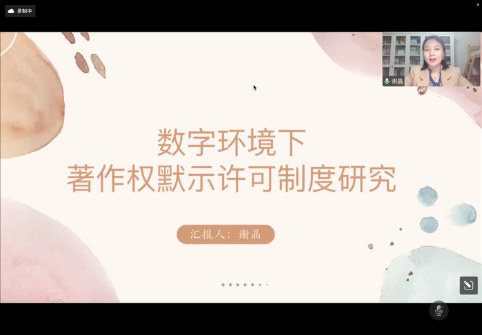 2022年11月14日晚,学院“研究生学术月”青年博士论坛如期召开,青年博士谢晶以线上会议的形式,为全院同学作了一场题为《数字环境下著作权默示许可制度研究》的学术报告。本次报告由吴迪老师主持,李玉璧教授参与讨论,我院一百余名同学聆听了此次讲座。