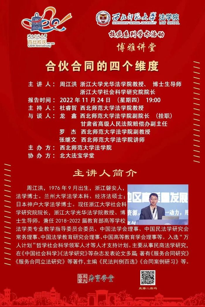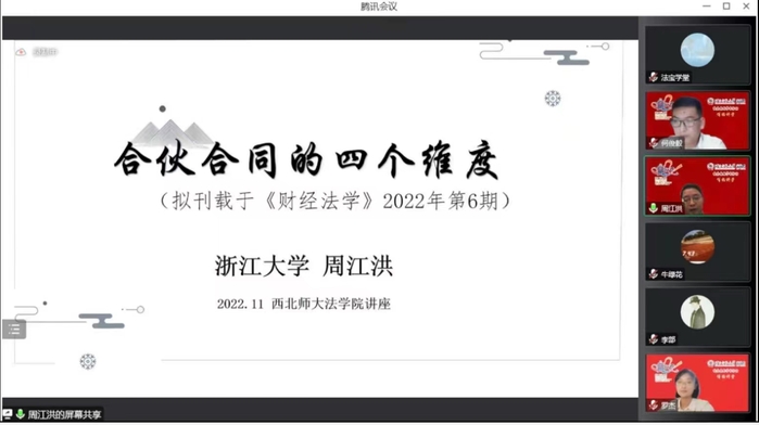 2022年11月24日,必赢线路检测3003no1邀请浙江大学光华学院教授、博士生导师,浙江大学社会科学研究院院长周江洪作《合伙合同的四个维度》的专题报告。本次学术报告是西北师范大学博雅讲堂资助一百二十周年校庆、学院十周年院庆系列学术活动。本次学术报告由何俊毅院长主持,龙鑫副院长、罗杰副教授和张继文老师作为与谈嘉宾交流研讨。本次学术报告由北大法宝·法宝学堂全程直播,近四千名听众在线参加。