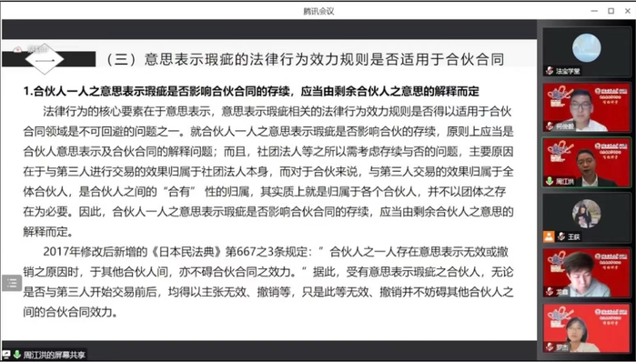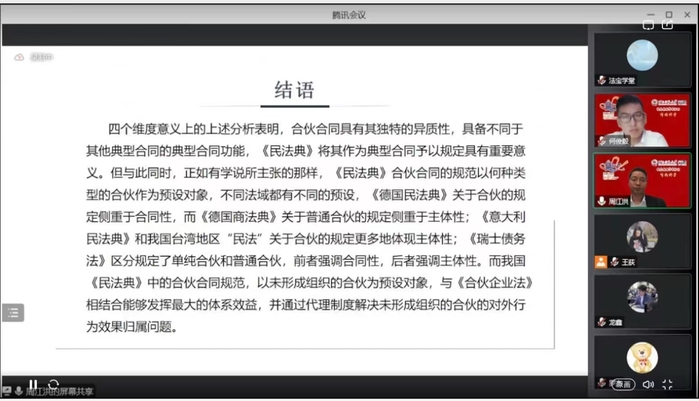 周老师首先介绍了合伙制度的变迁,其次从四个方面介绍了合伙合同的特点。第一个方面是作为法律行为的合伙合同。主要涉及合伙合同的成立、合伙人资格以及意思表示瑕疵的处理等。第二个方面是作为合同的合伙合同。周老师认为,合伙合同不适用于同时履行抗辩等双务合同中的特殊规则,而对于合同编通则中的其他规则,原则上仍应使用,但应根据各具体规则的制度目的以及合伙合同的特性具体判断。第三个方面是作为典型合同的合伙合同。合伙合同满足典型合同的典型性、特殊性、抽象性、规则缺失性,并具备典型合同的功能,故合伙合同典型合同的一种。合伙合同相关规范的适用或参照适用,仍有待学说和实务的进一步发展。第四个方面是作为组织型契约的合伙合同。合伙合同组织性不但指组织体意义上的“组织性”,同时也指替代市场功能组织功能的“组织性”。之后,周老师介绍了《民法典》合伙合同章与《合伙企业法》相关规范的关系。《民法典》主要从合同的角度对合伙作出规范,《合伙企业法》更多从主体角度对合伙作出规范。对二者的适用关系,仍有待于在个案中根据具体案情确定。最后,周老师对合伙合同的性质以及《民法典》和《合伙企业法》中的相关规定进行了评述。