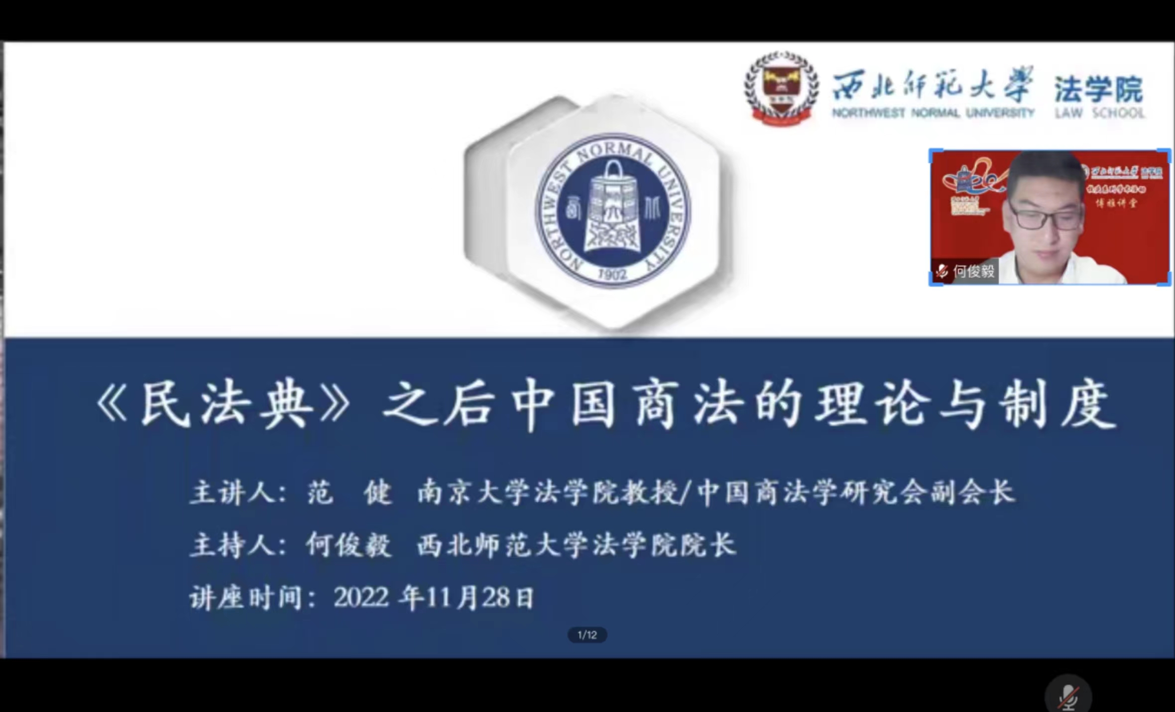 2022年11月28日,必赢线路检测3003no1邀请南京大学学院教授、澳门科技大学学院特聘教授、博士生导师,南京大学商法研究中心主任、中国商法学研究会副会长、亚洲商法研究院(新加坡)理事范健作《<民法典>之后中国商法的理论与制度》专题报告。本次学术报告是由西北师范大学博雅讲堂资助的一百二十周年校庆、学院十周年院庆系列学术活动,由何俊毅院长主持,李玉璧教授、王兰教授和张钰涵老师作为与谈嘉宾交流研讨,学院约三百名师生在线聆听。