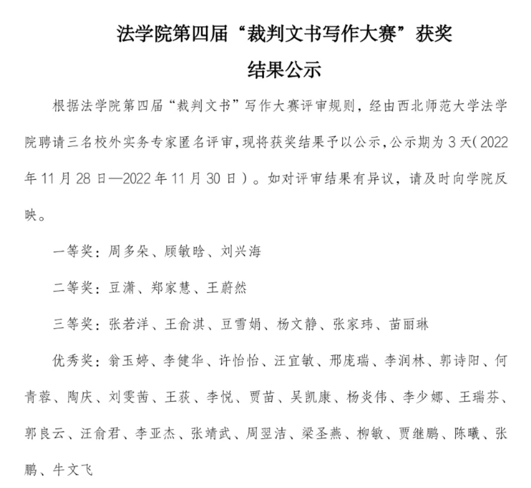 为落实《教育部中央政法委关于坚持德法兼修实施卓越法治人才教育培养计划2.0的意见》的基本要求,也为弥补当代法学教育对学生案例教学、裁判文书写作实践之不足,提高我院研究生法律实务能力、规范文书写作能力,我院特聘请三名校外资深法律实务专家根据本届“裁判文书写作大赛”的评审规则,于11月25日-28日对77份参赛文书进行评审。之后,学院根据参赛选手的平均得分对评审结果进行排序,最终确定获奖名单并公示。其中,一等奖3名,二等奖3名,三等奖6名,以及优秀奖28名。