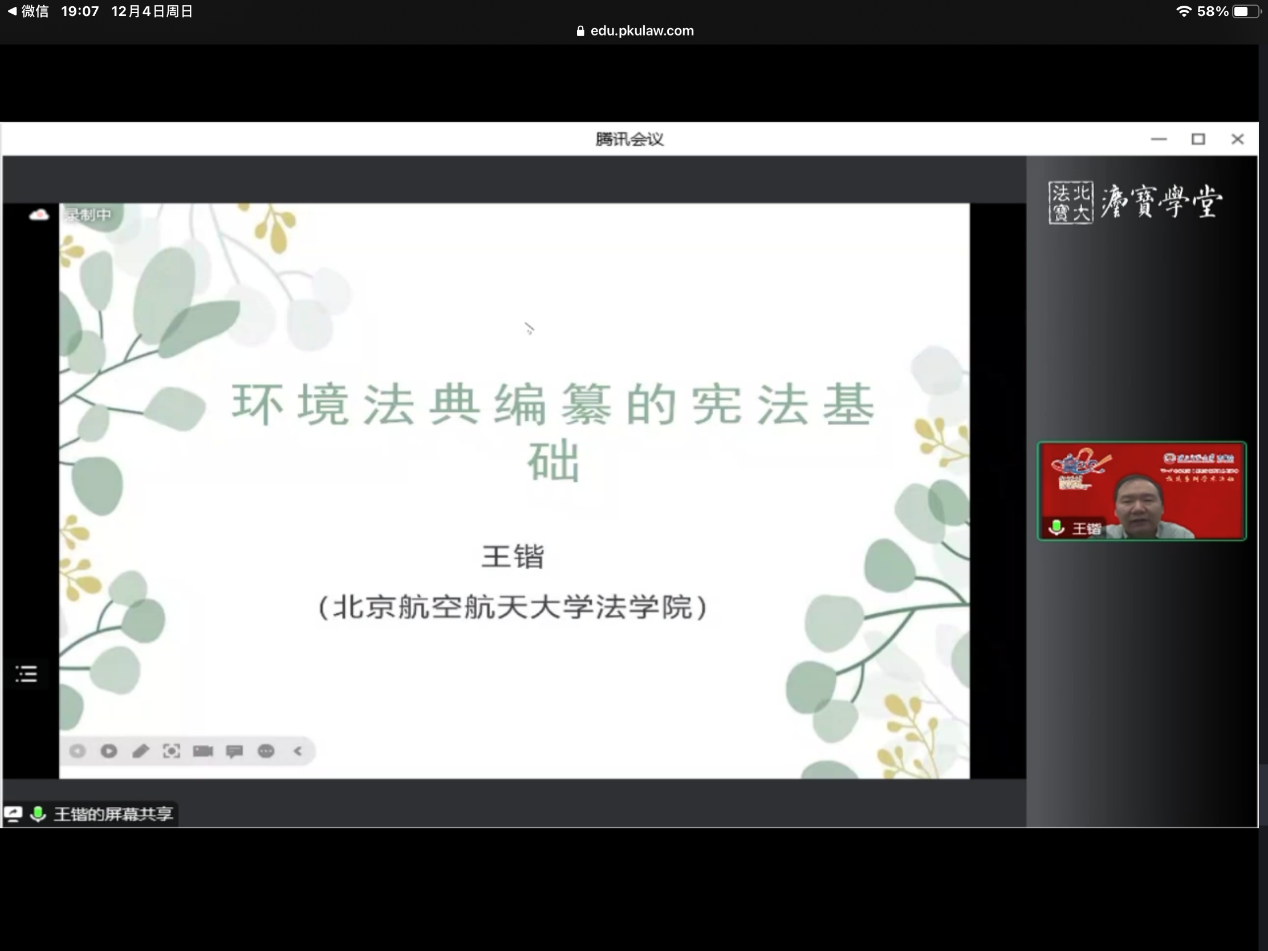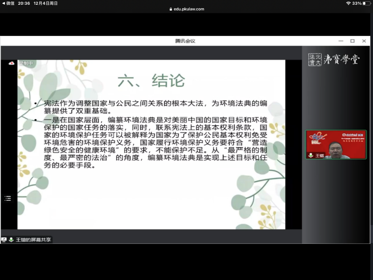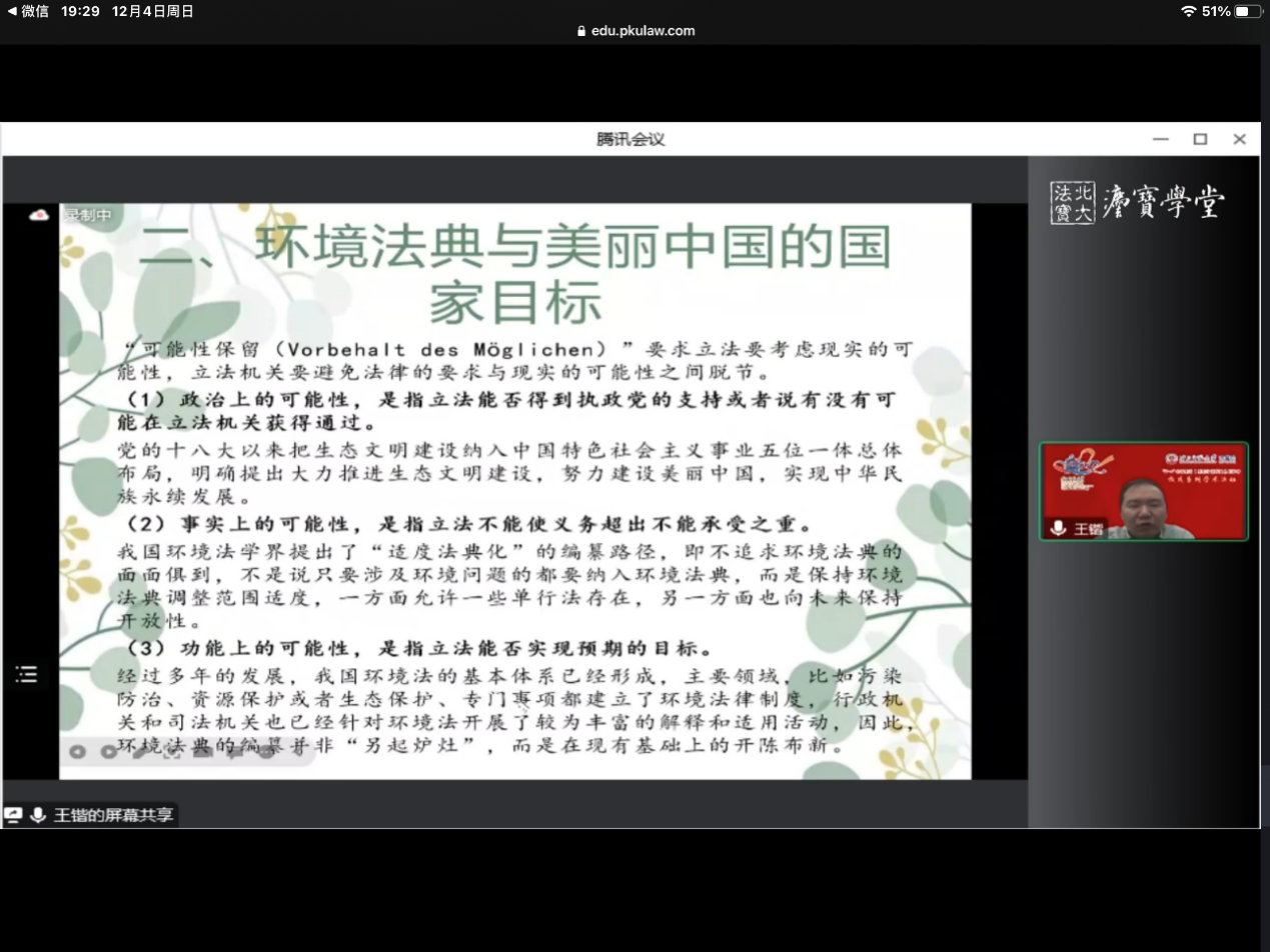 报告主要分为三个部分,法典编纂的意义、环境法典与宪法理论的联系结论。第一部分是法典编纂的意义。法典编纂是实现国家法治统一的必然要求,能够实现内在体系和外在体系的统一。外在体系上,环境法各法条散布于265部立法中、体量巨大,具有形成体系化法典的必要性。内在体系上,可持续发展是我国环境法治的逻辑主线和核心价值。因此,环境法典具有编纂的意义。第二部分是环境法典与宪法理论的联系。一是环境法典与美丽中国的国家目标国家目标是国家前进的方向,是具有法律约束力的宪法规定,通过立法来实现。而立法要有实现的可能性,环境法典的编纂具有政治上、事实上、功能上的可能性。二是环境法典与环境保护的国家任务通过对比较法以及对中国法律的考察,王老师提出国家保护任务可以证成为国家环境保护义务,即国家为了保护某些权利免受环境危害而需要对环境进行治理的国家保护义务。编纂内外体系统一的环境法典对于环境保护更有力。三是环境法典与公民的环境基本权利公民的环境权在《宪法》中无明确规定,但其作为人权已经得到越来越多的共识。环境权是一种基本权利,是请求国家进行给付的社会权。四是环境法典与公民环境保护义务之间的关系公民的环保义务是法律义务而不是宪法义务。环境法典编纂的意义不仅是形成公民环境基本权的保护范围,同时也形成公民环境保护的法律义务。第三部分是结论王老师认为宪法作为调整国家与公民关系的根本大法,为环境法典的编纂提供了双重基础通过环境法典的编纂可以建构起公私兼顾、以环境权和环保义务为架构的环境法律关系。
