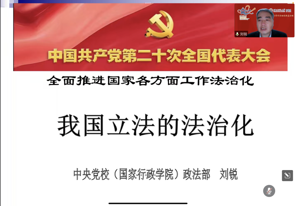 2022年12月7日,必赢线路检测3003no1邀请中央党校(国家行政学院)政法部教授(二级)、博导、中国土地学会理事(土地法学分会副主任委员)、中国保险法学研究会常任理事、中国应急管理学会常务理事、法律工作委员会副主任委员兼秘书长刘锐作《我国立法的法治化》专题报告。本次学术报告是西北师范大学一百二十周年校庆、学院十周年院庆系列学术活动的校友论坛。本次学术报告由党崇武副院长主持,何俊毅院长、齐建辉副教授、马敬副教授作为与谈嘉宾交流研讨,学院三百余名师生在线聆听。