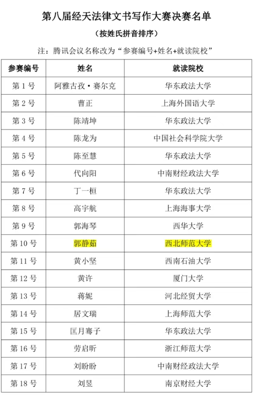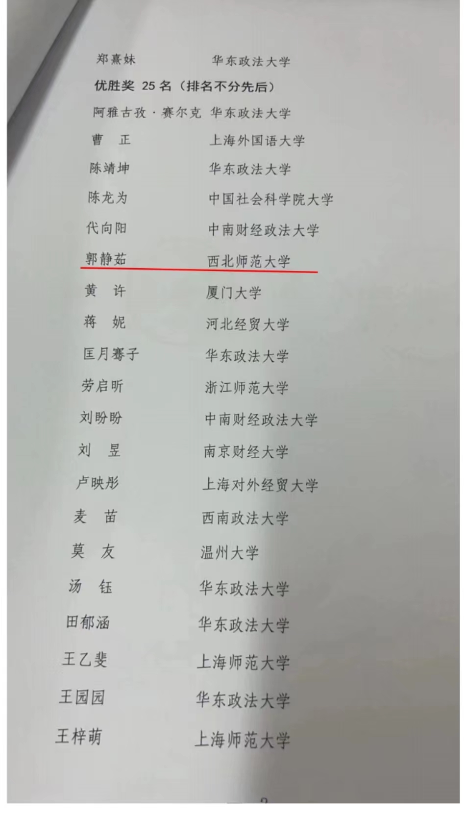 2022年11月27日,由上海市法律硕士专业学位研究生教育指导委员会主办,华东政法大学研究生院承办的第八届经天法律文书写作大赛落下帷幕。我院2021级法律(法学)专业硕士研究生郭静茹荣获优秀奖,在该赛事上创造了新成绩。