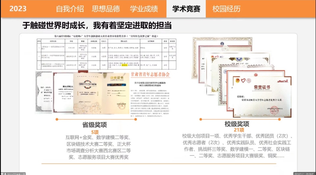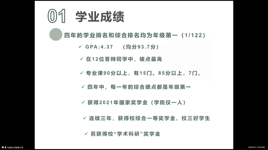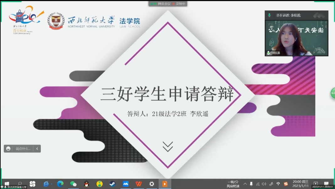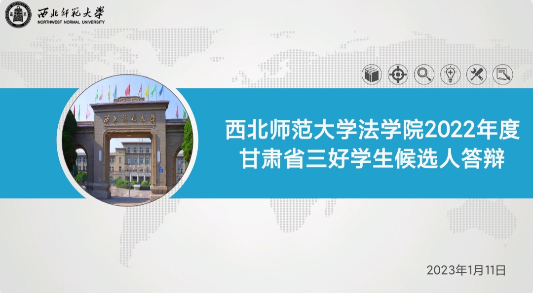 为弘扬先进榜样,树立先锋模范,加强学风建设,2023年1月11日19:30分,我院于腾讯会议举行了2022年度甘肃省高校三好学生的公开答辩会。此次答辩会由王金元、蔡芳、田庆锋、马敬、张继文、唐风玉和白洁7位老师作为评委参加评选,多名同学线上观摩学习。