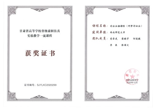 甘肃省省级虚拟仿真一流课程 | 非法证据排除(刑事诉讼法) | 2020 | 省级 | 甘肃省教育厅 |