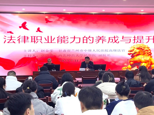 2023年11月30日下午,西北师范大学学院邀请兰州市中级人民法院高级法官、刑二庭庭长赵金荣于模拟法庭为我院师生作题为《法律职业能力的养成与提升》的专题报告。报告由我院党崇武副院长主持。
